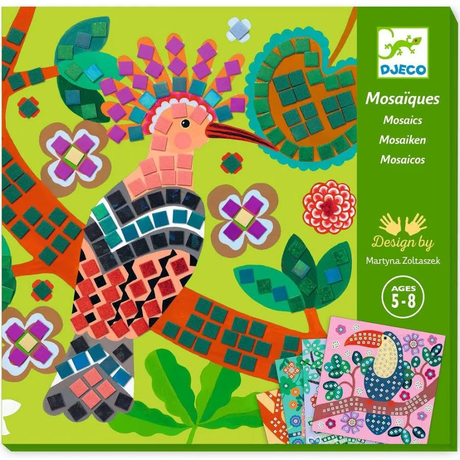 Un coffret pour s’initier à l’art de la mosaïque. 4 tableaux à décorer en collant des petits carrés de mousse métallisés. L’enfant repère les numéros, puis colle les pièces correspondantes à l’emplacement désigné. Les tableaux se remplissent et une nature luxuriante apparaît.