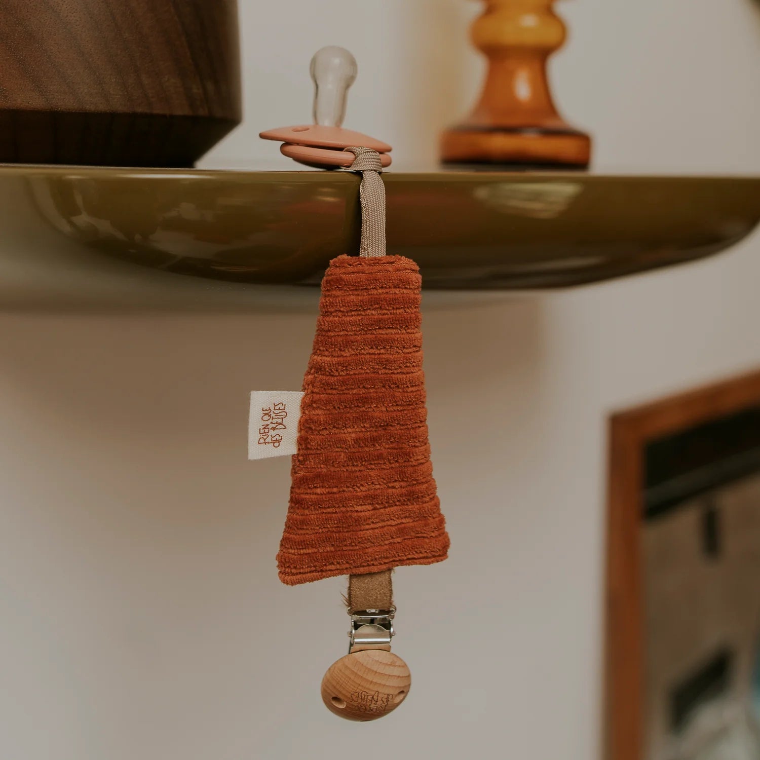 Notre attache tétine en velours paprika est l’accessoire parfait pour ne plus jamais perdre la sucette de bébé !