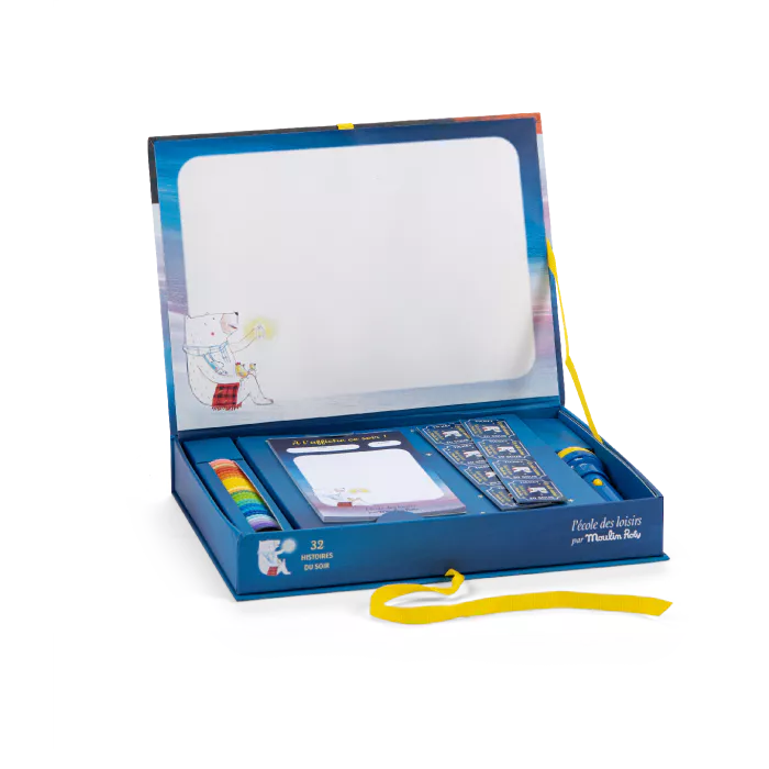 Le cinéma à la maison ! 32 histoires emblématiques de l'école des Loisirs à projeter réunies dans un coffret luxe, comprenant une lampe, 32 disques diapositives, un bloc de programmes et des tickets de cinéma pour partager la séance avec les copains….