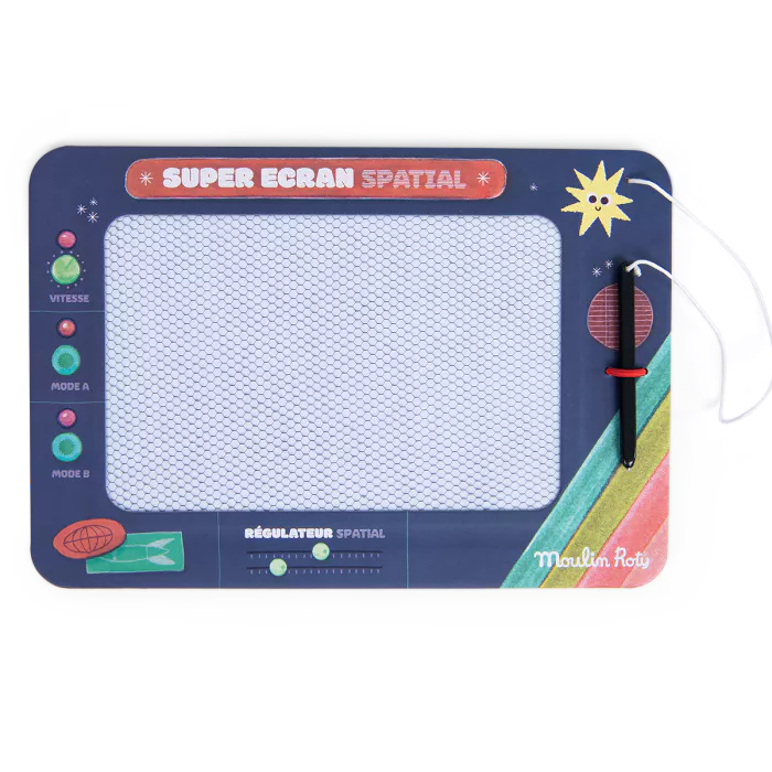 Principe de l'ardoise magique pour cet écran magnétique illustré comme un écran de contrôle d'une fusée spatiale : boutons, curseurs ... Avec le stylet, sur la partie alvéolée, l'enfant peut écrire et dessiner dessus à l'infini ! Pour effacer le message, il suffit de tapoter sur l'ardoise.