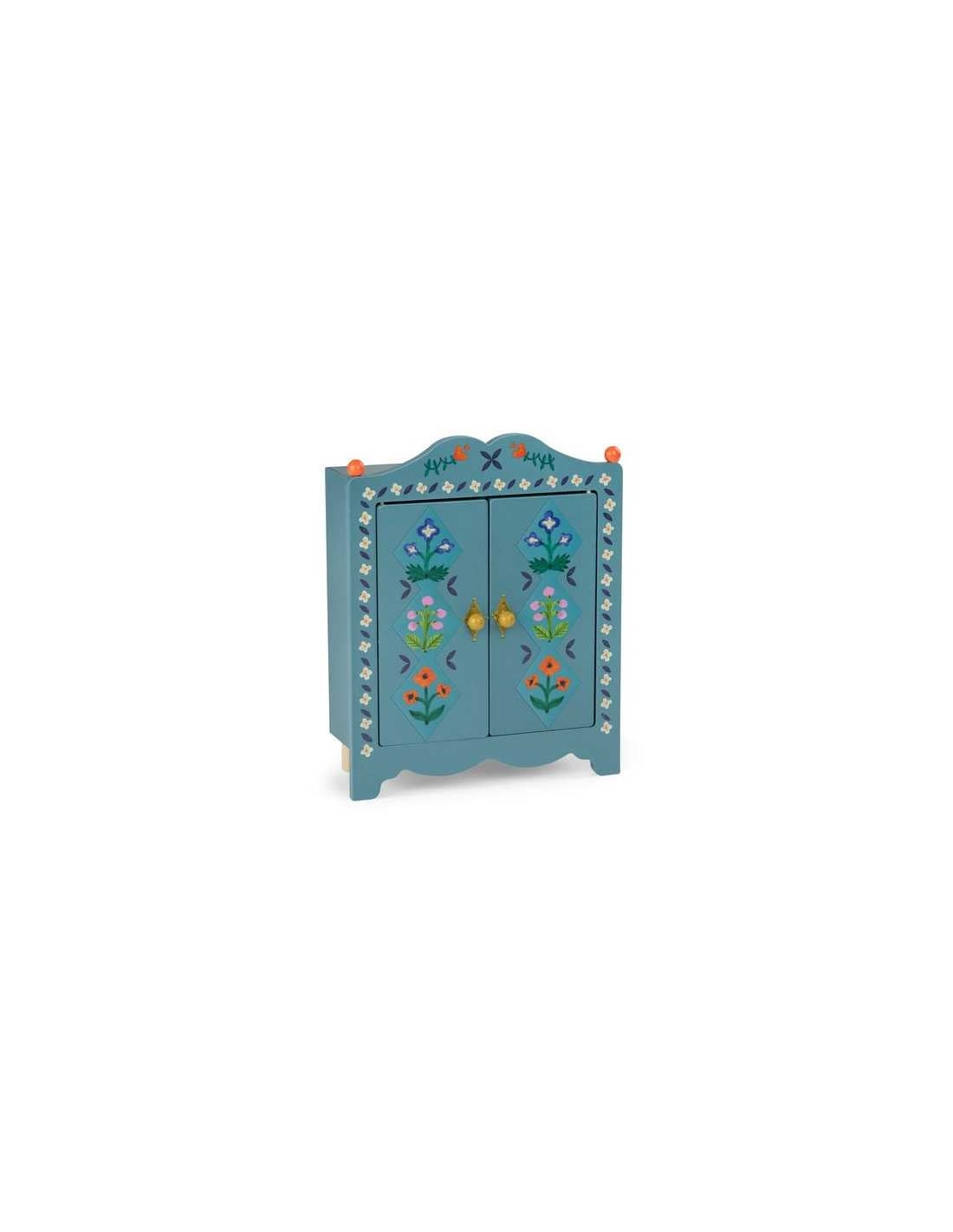 Découvrez l'armoire en bois de la collection Les Minouchkas de Moulin Roty, des accessoires de maison de poupée pour se raconter de belles histoires avec les poupées articulées Minouchlas à partir de 3 ans.