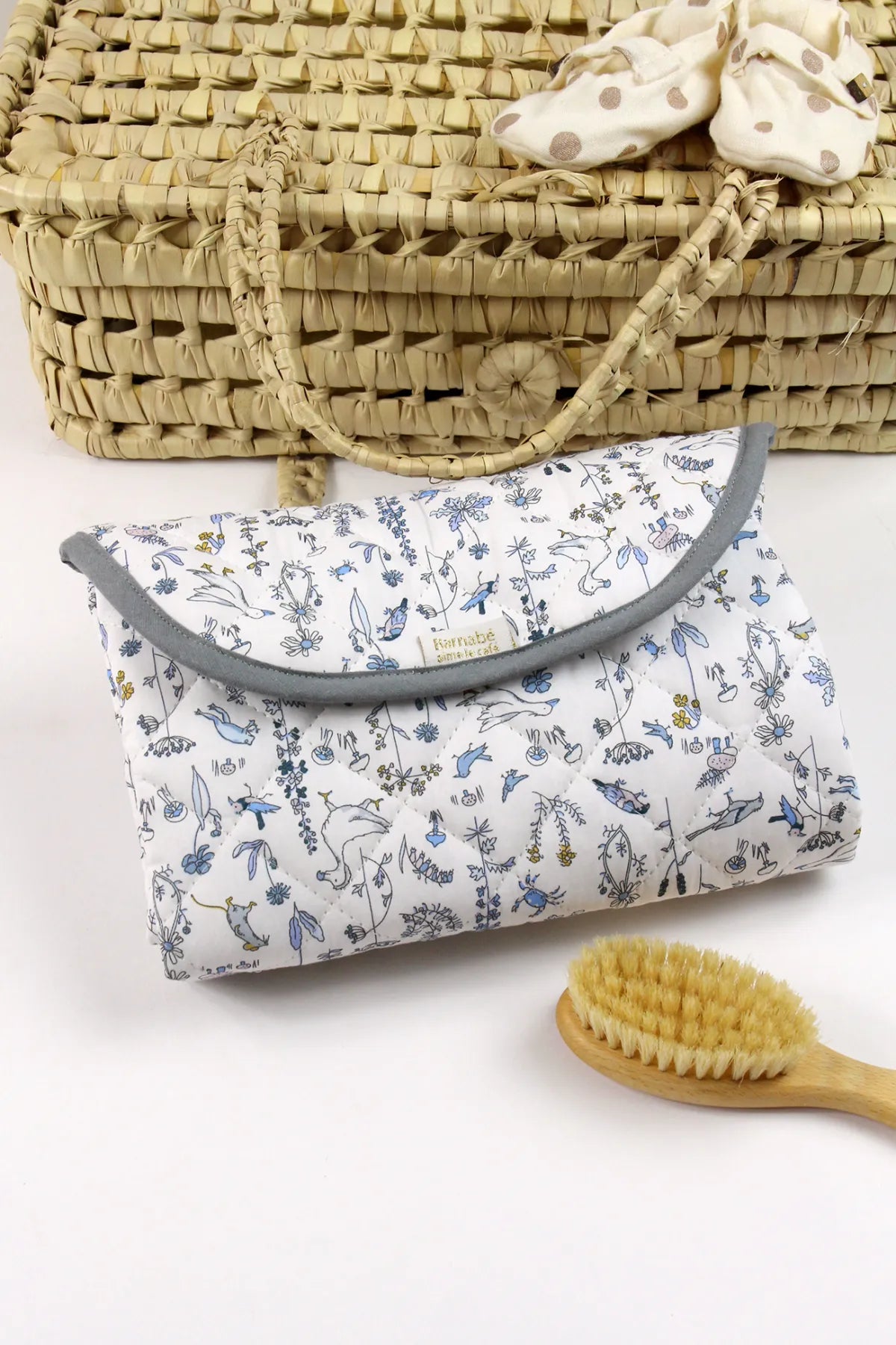 Ce tapis de change nomade en tissu Liberty® molletonné, très pratique grâce à son intérieur plastifié.