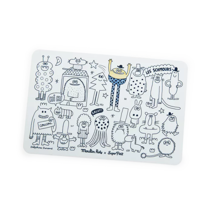 Colorie, efface et recommence à l'infini avec ce mini set SuperPetit en silicone et ses 4 feutres. Un côté coloriage à partir d'une illustration des Schmouks et un côté dessin libre. Facile à transporter et à nettoyer avec un chiffon sec ou humide.