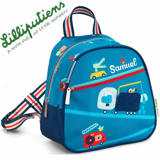 Le compartiment principal comprend une petite pochette et un élastique qui permet de maintenir une gourde. Le compartiment avant est quand à lui doté d'un emplacement pour y glisser une photo afin que votre enfant puisse prendre la place d'un conducteur de chantier.