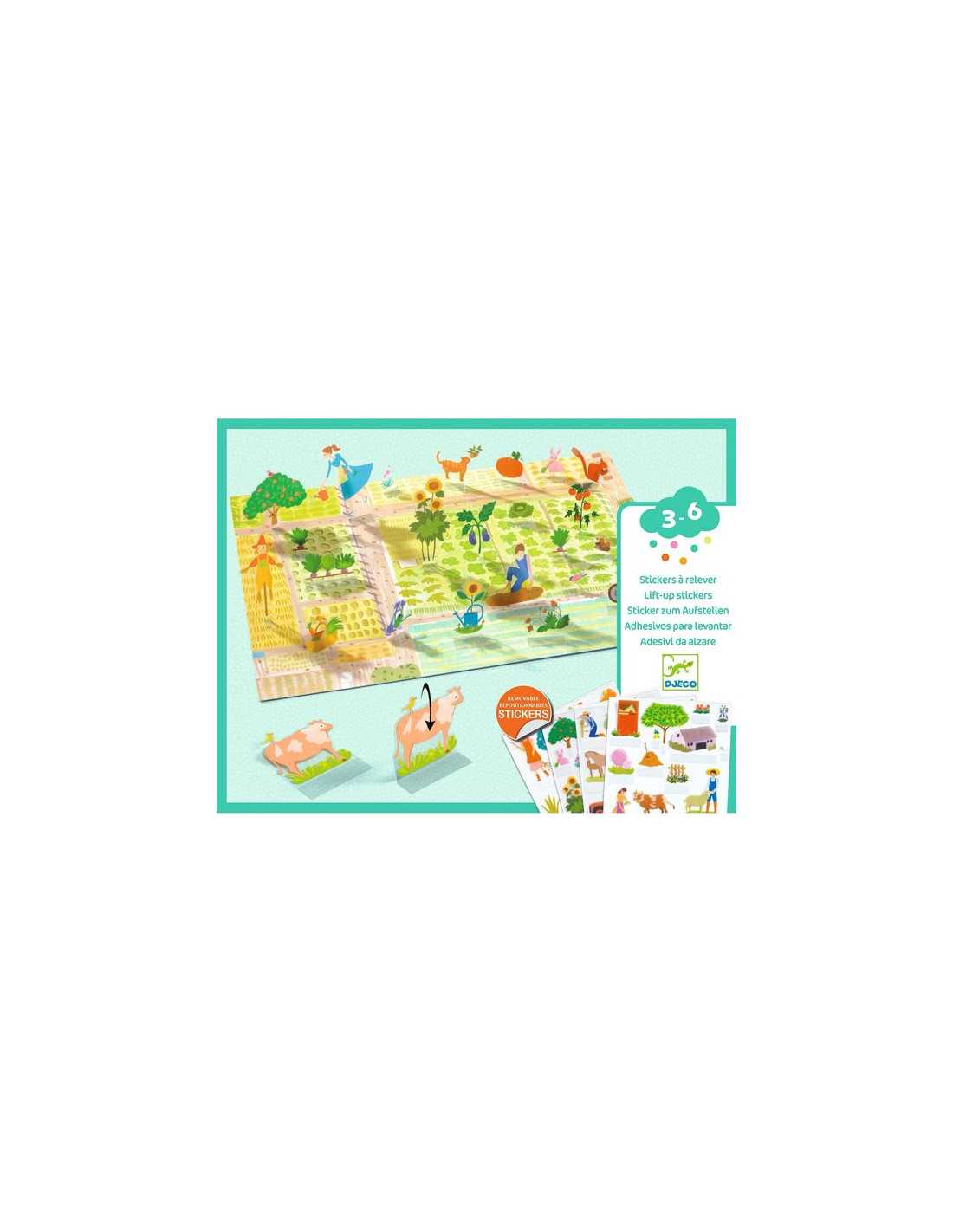 L’enfant colle les stickers sur les grandes images, puis les relève un à un… pour créer des scènes en volume, et s’inventer des histoires sur le thème de la campagne : tracteur, animaux de la ferme, jardin potager...