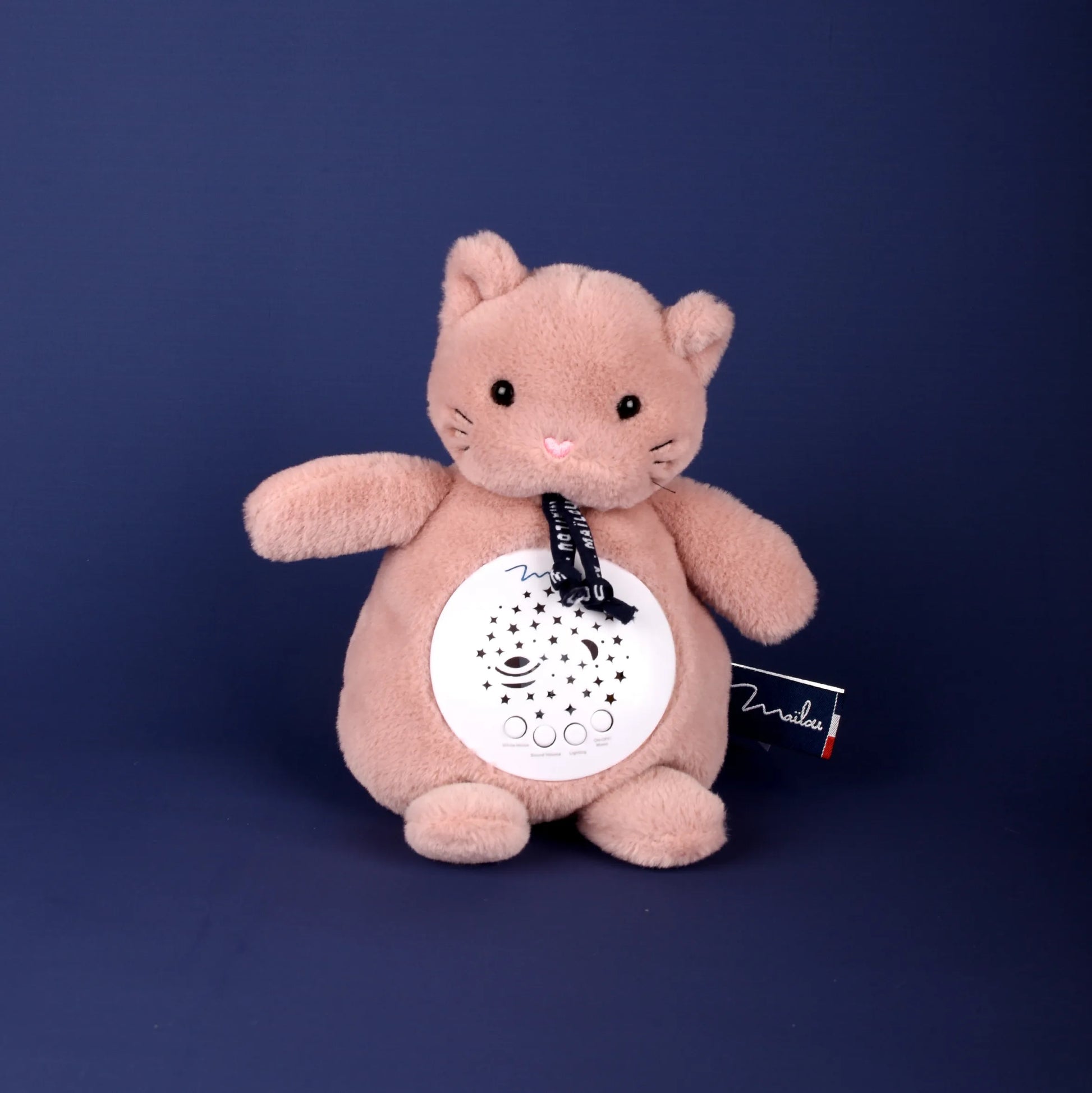 Veilleuse Chat Rose Maïlou 19 cm, peluche musicale lumineuse fabriquée à la main en Bretagne. Idéale pour les bébés, douce et rassurante.